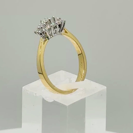 The contrasting 18ct yellow gold shoulders and shank add warmth and sophistication, creating a timeless piece that radiates luxury and brilliance. Perfect for those seeking a distinctive and elegant statement ring.