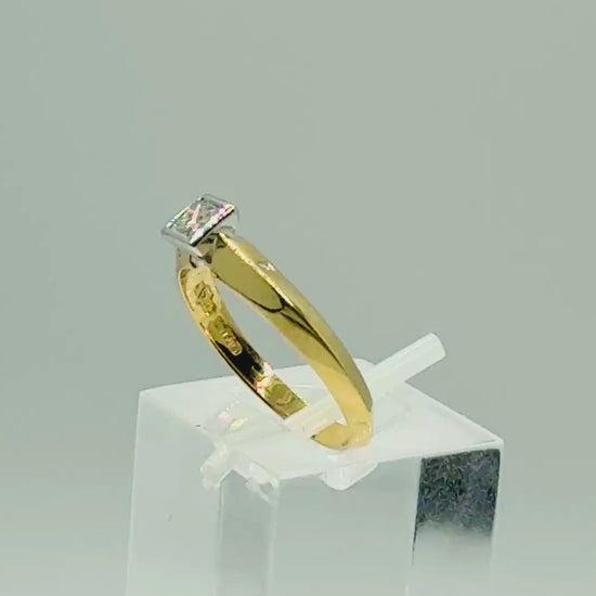 This exquisite 18ct yellow and white gold ring features a stunning princess cut diamond at its centre, flanked by delicate round cut diamonds on each shoulder.