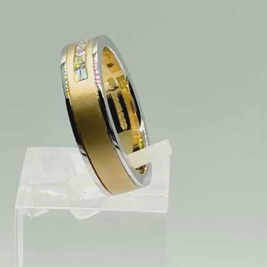 This sophisticated 18ct bi-colour gold ring offers a stunning blend of textures and tones. The 5mm flat band features a unique contrast: a soft brushed yellow gold centre is perfectly framed by sleek, polished white gold edges.