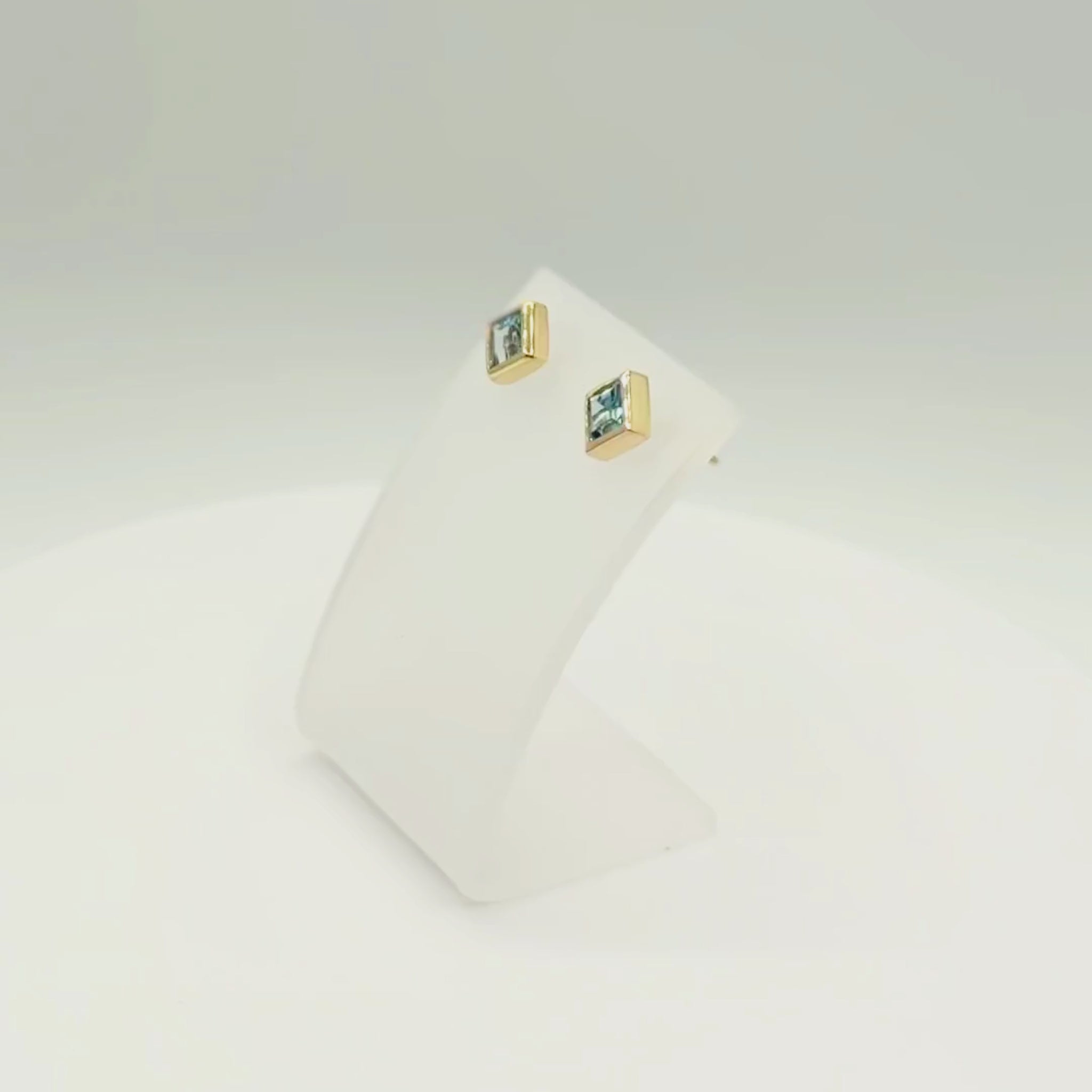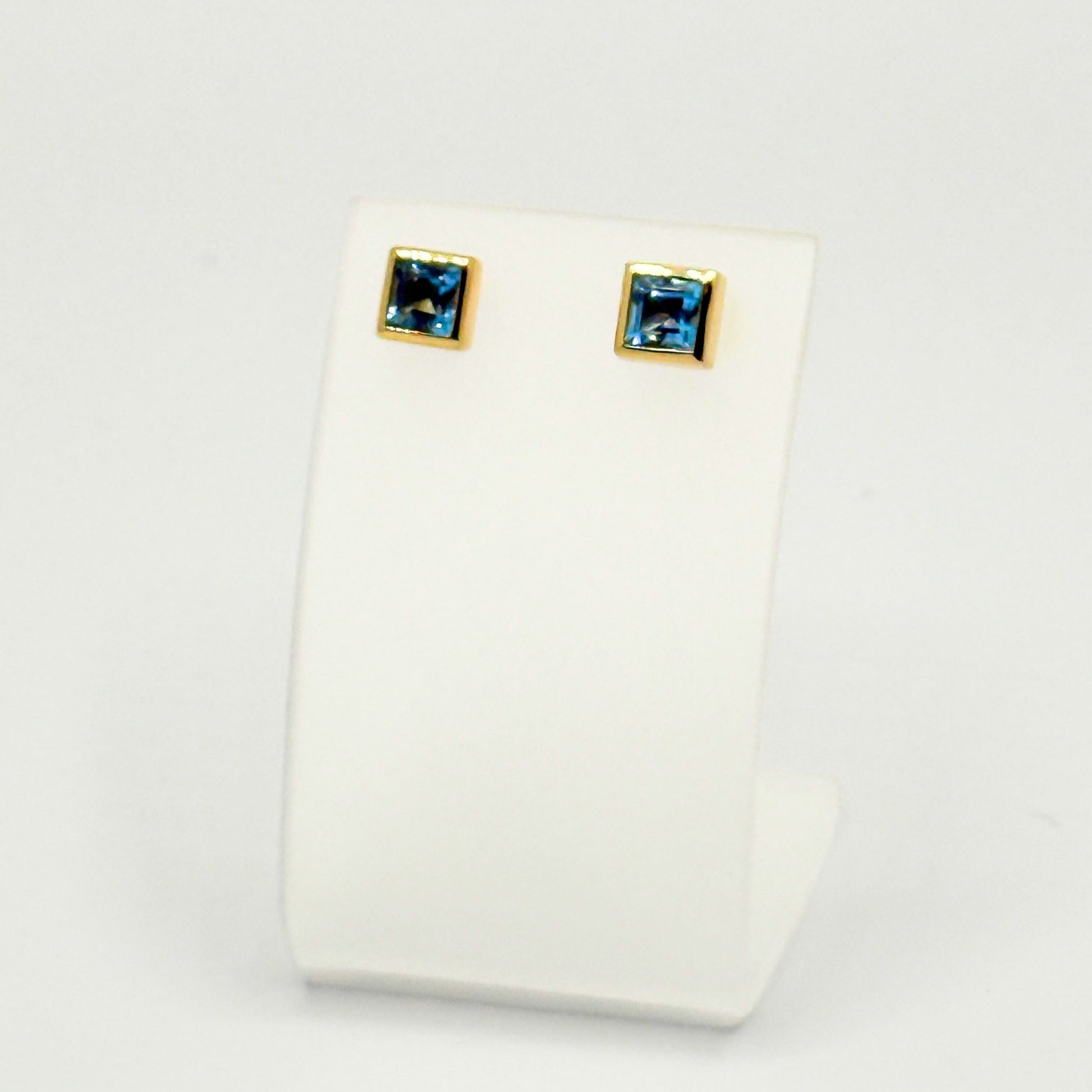 These elegant 9ct Yellow Gold Stud Earrings are a perfect blend of modern design and classic charm. Each stud features a stunning square-cut Blue Topaz; its vibrant colour beautifully complemented by the warm glow of the gold.