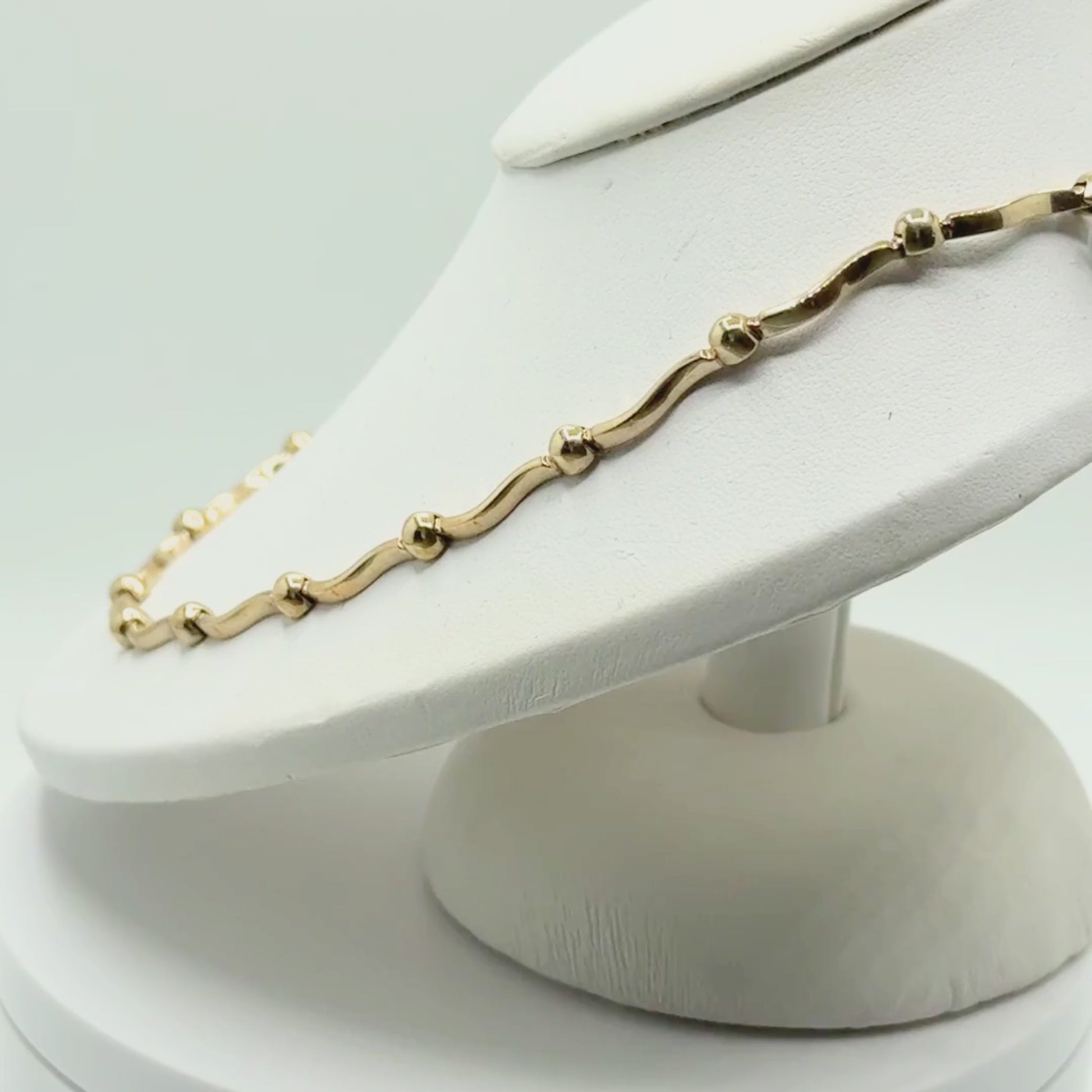 Adorn your neckline with this lovely 9ct yellow gold linked necklet. The fluid design features highly polished, curved links gracefully joined by smaller gold ball links, creating a dynamic and elegant drape.